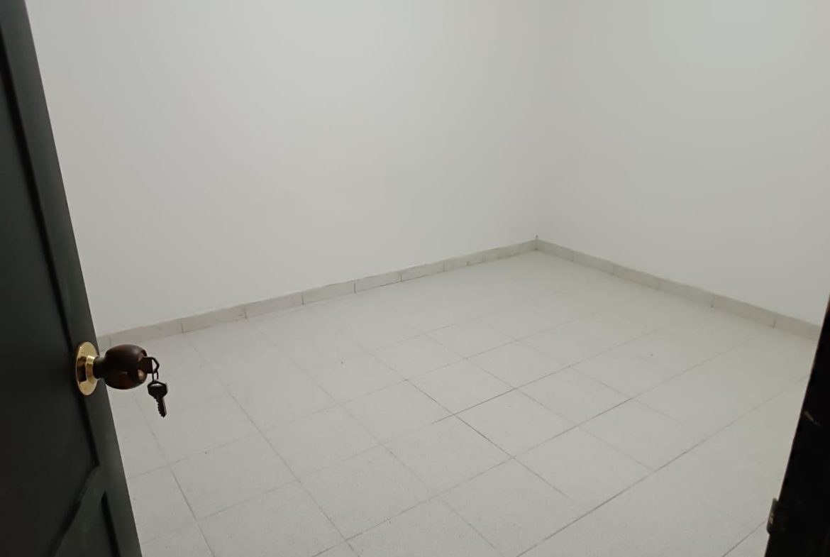 garaje eléctrico, sala, comedor, cocina integral, baño social, patio de luz, zona de oficios y alcoba de servicio con baño.